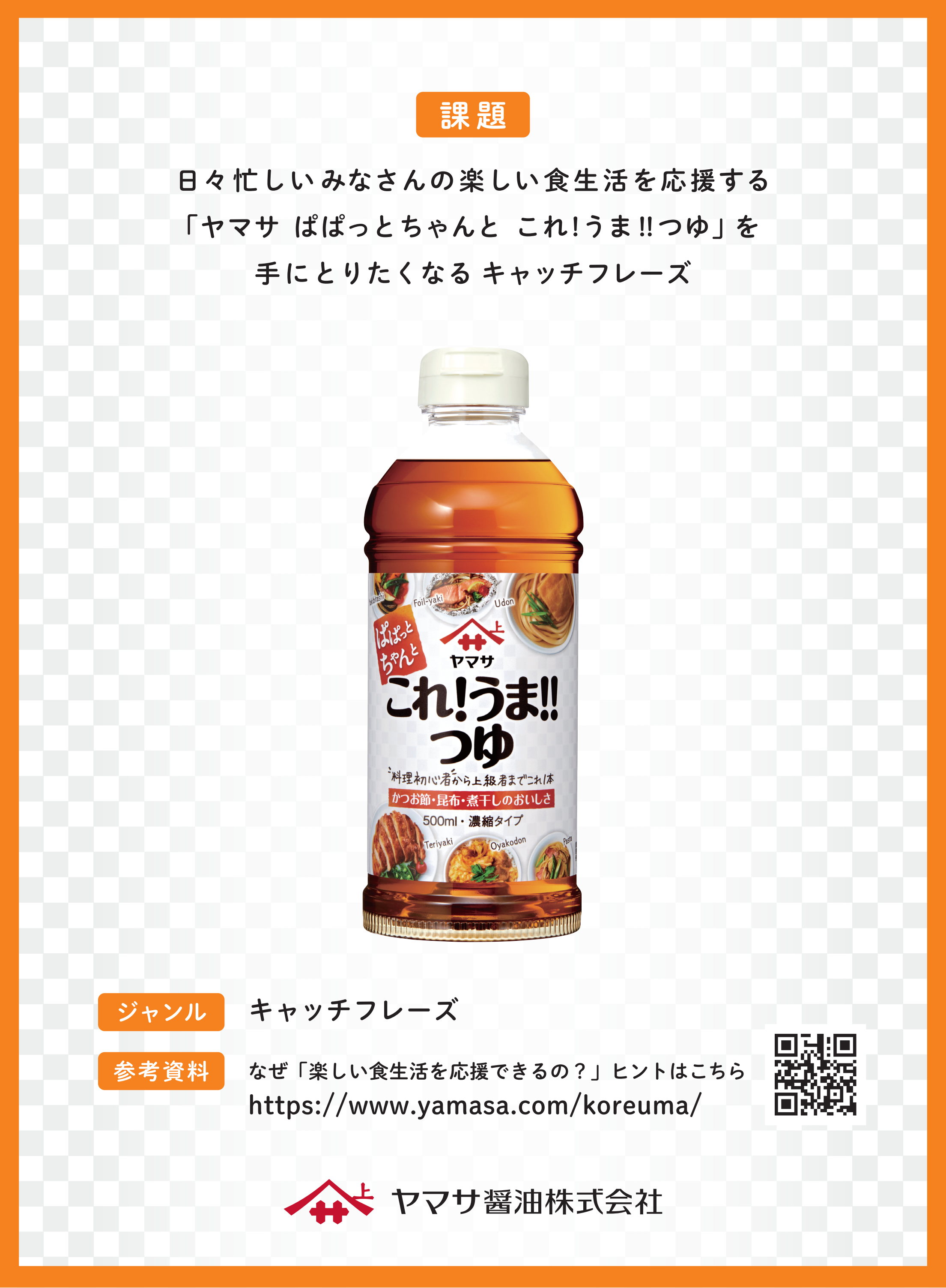 日々忙しいみなさんの楽しい食生活を応援する「ヤマサ ぱぱっとちゃんと これ! うま!! つゆ」を手にとりたくなるキャッチフレーズ